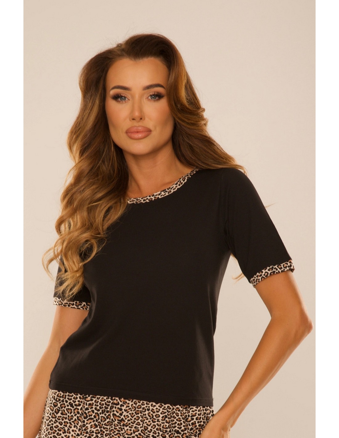 Bluzka damska KENDALL 849 to propozycja dla pań, które cenią wygodę i styl na co dzień. Uszyta z wysokiej jakości mieszanki modalu, bawełny i elastanu, zapewnia miękkość, elastyczność i przewiewność. Klasyczny krój z krótkim rękawem i okrągłym dekoltem sprawdzi się zarówno jako baza domowego outfitu, jak i element piżamowego zestawu. Dekolt został subtelnie ozdobiony lamówką w panterkowy wzór, który dodaje bluzce modowego akcentu. Świetnie komponuje się z szortami i spodniami z kolekcji Kendall.