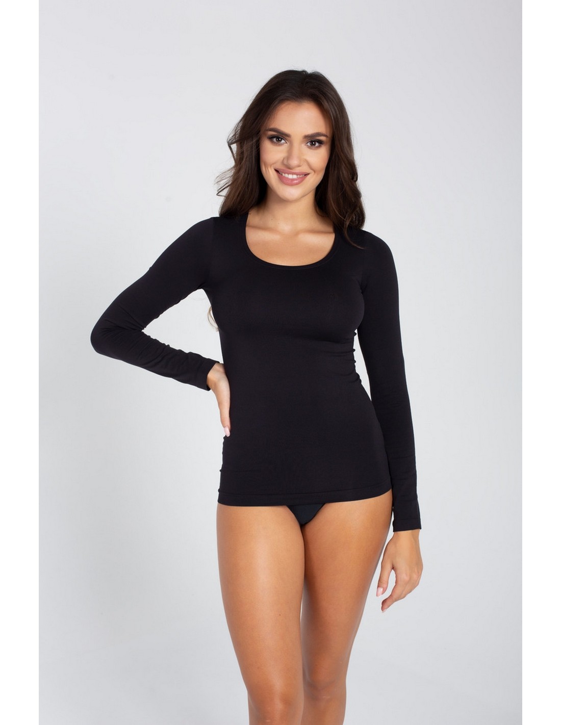 T-shirt Perfect to gładka koszulka damska z linii Basic Line. Posiada rękawy o długości 3/4, a przy szyi wykończona dużym, owalnym dekoltem obszytym cienką elastyczną lamówką. Wykonana z elastycznej dzianiny poliamidowej z dodatkiem elastanu, jest bardzo miła i miękka w dotyku, doskonale dopasowuje się do kształtu ciała, a brak bocznych przeszyć podnosi komfort noszenia.